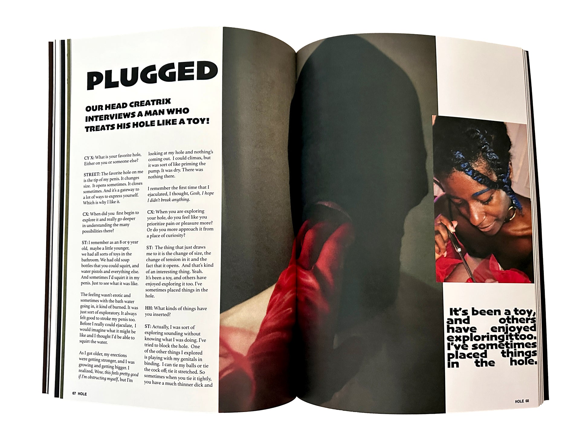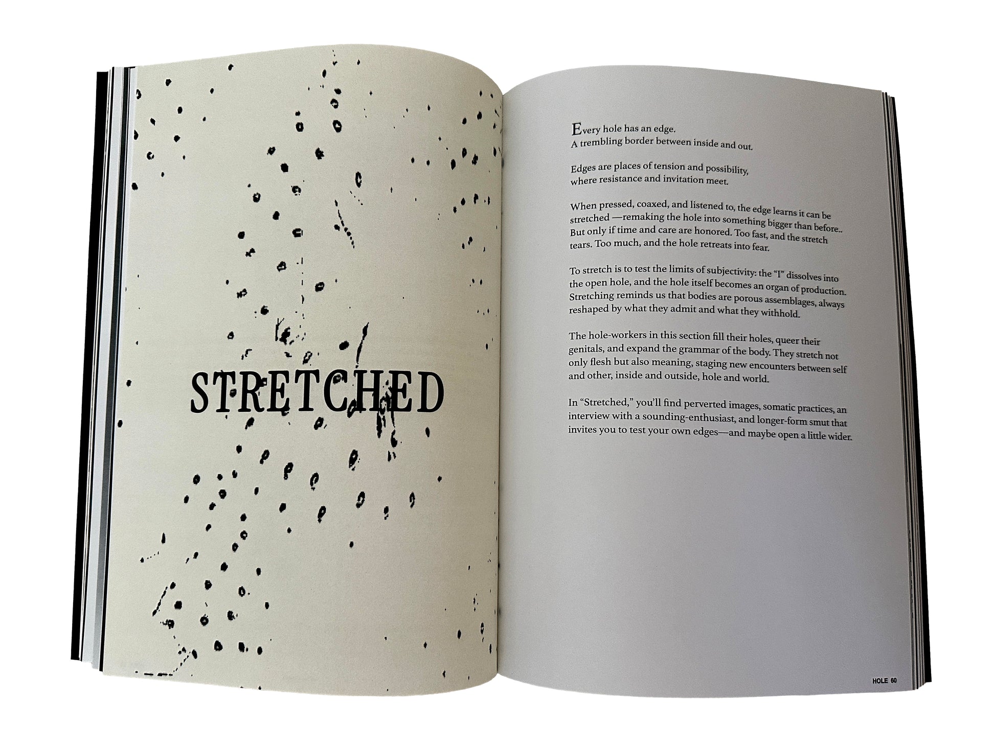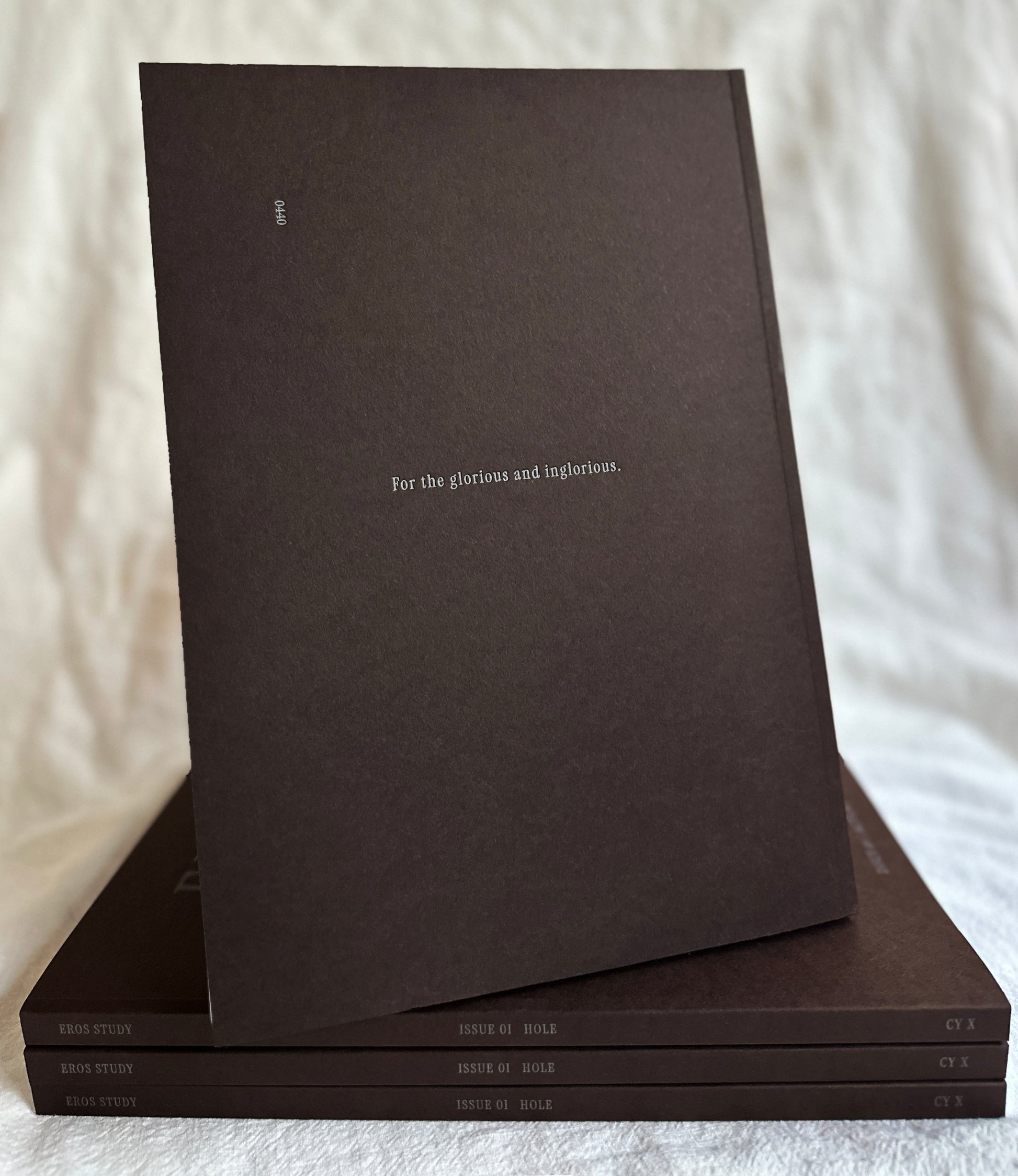 Eros Study: Hole, Issue 01 by Cy X is a hybrid fetish magazine and art book collecting the work of 20 international contributors across performance, photography, theory, and kink. This inaugural issue dives into holes—glorious and inglorious alike. Holes that gape, swallow, whisper, or leak. Holes as the sites of touch and trauma, of shame and ecstasy, of disappearance and rebirth. From the cavities of the body to the burrows of the earth, this issue invites you to move beyond the edge, and linger with the hole.